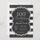 100º Convite de Aniversário para mulheres ou homens. Festa de aniversário Negra e Prata Convidam. Glitter Prateado Confetti. Black and White Stripes. Digital Imprimível. Para mais personalização, clique no botão "Personalizar" e use nossa ferramenta de design para modificar este modelo.