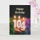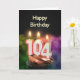 Um bolo de aniversário com velas. As velas são compostas pelo número 104, para um centenário. Um cartão de aniversário adequado para todos.
