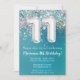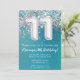 convite de aniversário de Aniversário do Convite para Teal e Glitter de Prata para um 11 de 11 anos com moderno roteiro escrevendo e balões de folha divertida.