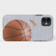 Capa de iPhone 5 personalizada para fãs de basquete, com gráficos de um padrão de camiseta esportiva cinza claro no fundo. Gráficos de uma bola de basquete decoram o canto inferior direito da capa e texto personalizado na cor ferrugem, no lado esquerdo, está pronto para personalizar. Ótima capa de telefone para o fã de esportes ou jogador de basquete.