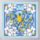 Um passarinho do estilo Art Nouveau senta-se num galho com bagas e flores. Este impressão quadrado único é executado em tons de azul e amarelo.
