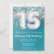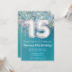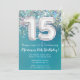 convite de aniversário de Aniversário do Convite para Teal e Glitter de Prata para um 15 de 15 anos com moderno roteiro escrevendo e balões de folha divertida.