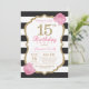 Convite de Aniversário de 15. Preto rosa e Dourado. Dourada Glitter. Black and White Stripes. Flor Floral Rosa.Aniversário de crianças. Festa de aniversário de adolescentes.