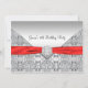 Prata elegante com fundo de revestimento de rendas prateadas e fita vermelha de satin e convite de aniversário 15 de quinceanera de centro de diamante.