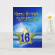 Uma grande estrela de ouro brilhante na qual você pode colocar o nome do aniversariante. O fundo é azul com lindas espirais brancas.