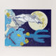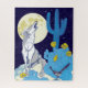 Um coiote uivante sob uma lua de cheio, projetado exclusivamente em tons de azul, amarelo, cinza e branco.