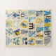 Peças sobredimensionadas e arte lúdica em alfabeto em tons de azul, amarelo, preto, cinza e branco.