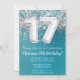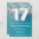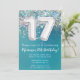 17º Aniversário do Convite Teal e Silver Glitter 17º convite de aniversário por um jovem de 17 anos com modernos escrevendo de escrita e balões de folha divertida.