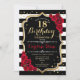 18º Convite de Aniversário design vermelho preto Elegante com brilho falso. Listras pretas e brancas com rosas vermelhas. Perfeito para uma bolsa mensageifesta de aniversario elegante.