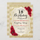18º Convite de Aniversário. Design elegante em ouro e vermelho. Apresenta faixas de ouro com brilho sutil, fonte de script do rosa vermelha na moda e confetti. Perfeito para uma festa de aniversário de vidro.