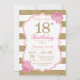 18º Convite de Aniversário, rosa e Dourado. Rosa e Dourado brilho. Listras brancas e rosa. Flor Floral Rosa. Aniversário Adulto. Festa de aniversário feminina.