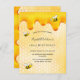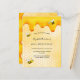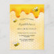 Elegante, divertida, convite de festas de verão de 18 anos. Fundo amarelo, branco com um padrão de mel. Decorado com ouro, bebendo doce e abelhinhas felizes. O nome é escrito com um moderno estilo escrito à mão. Letras negras. Perfeito para uma festa de chá de verão em um jardim, quintal. Traseira: padrão amarelo de mel branco e uma abelha feliz. Dica: Se você não quiser que pareça um cartão postal, clique em personalizar, vá para o verso e remova o divisor e o carimbo de posto.