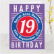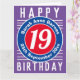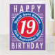 Cores brilhantes e design ousado. Cartão de aniversário numerado. 19 anos.