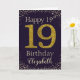 Parabéns com o número 19 simulado de brilho de ouro em uma cor sólida e emoldurado por diamantes falsos e rotinas. Feliz aniversário e nome dos destinatários em letra esbranquiçada. Personalizar com nome ou mensagem.