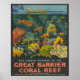 Great Barrier Reef vintage travel poster: a luminous coral reef scene bursting with tropical fish and classic Australian tourism charm from 1933.
