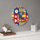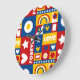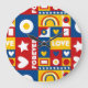 Uma seleção de caixas forma uma grade com formas cardíacas, estelares e geométricas para criar um padrão vibrante cuja mensagem é sempre amor. Inspirado pelas cores e tendência retrorativa da pop nos anos 1980. Cores primárias brilhantes de vermelho, azul e amarelo com formas brancas e texto. Design de um artista independente, Rene Dauphine.
