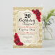 Convite de aniversário de 20. Design elegante em ouro e vermelho. Apresenta faixas de ouro com brilho sutil, fonte de script do rosa vermelha na moda e confetti. Perfeito para uma festa de aniversário de vidro.
