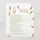 Convites para chuveiros de bebês neutros em termos de gênero. Apresentando o ditado "UM PEQUENO BUNNY ESTÁ A CAMINHO!", uma ilustração de um coelho aquoso (coelho) com cenoura em patas, e muitas cenouras cor de laranja. Itens correspondentes disponíveis.