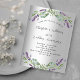 Um fundo de olhar mal prateado. Decorado com flores lavandas e eucalipto verde. Personalize e adicione seus nomes e detalhes. 1 folha = 1 convite impresso de borda a borda.