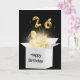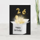 Balões Dourados e feixes de luz cintilantes brilham em uma caixa branca sobre fundo preto para o 26º aniversário O texto de Feliz Aniversário na caixa branca pode ser alterado.