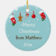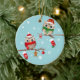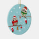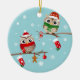 2 corujas nos ramos que são decorados com meias do Natal, homem de pão-de-espécie, bastão de doces e bola do Natal. As corujas têm chapéus do papai noel e scarves vermelhos e verdes. O fundo é cerceta clara e flocos de neve brancos. A parte traseira do ornamento tem uma meia, um bastão de doces e um homem de pão-de-espécie na parte superior e nos flocos de neve na cerceta clara. Todos os textos são customizáveis.