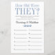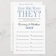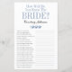 Esta bela folha de jogos de chá de panela com Quantos Idosos Tinham? na frente e Como Conhecem A Noiva? atrás é simples e encantadora - perfeita para o vosso chá. Estes jogos divertidos e fáceis trazem muitas risadas ao seu chá de panela! Peça a familiares e amigos que lhe enviem fotos da noiva e do noivo em todas as idades e que as façam imprimir. Numerá-los e colocá-los perto destas folhas de jogo. Basta dar uma folha a cada convidado (não se esqueça das canetas) e deixar a competição começar pelo primeiro jogo! Ficará surpreso com quantas pessoas conhecem realmente a idade da noiva e do noivo. Depois, sacudir a folha e dê 5 minutos aos convidados para responder às perguntas. Você vai descobrir quem realmente conhece a noiva. Em segundos você pode ver como sua folha de jogo ficará. Basta selecionar Personalizar este Modelo e digitar os nomes da noiva e do noivo.