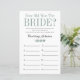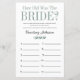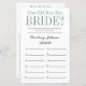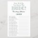 Esta bela folha de jogos de chá de panela com Quantos Anos Era a Noiva? na frente e Quão Bem Conhece a Noiva? atrás é simples e encantadora - perfeita para o seu chá. Estes jogos divertidos e fáceis trazem muitas risadas ao seu chá de panela! Peça a familiares e amigos que lhe enviem fotos da noiva em todas as idades e que as façam imprimir. Numerá-los e colocá-los perto destas folhas de jogo. Basta dar uma folha a cada convidado (não se esqueça das canetas) e deixar a competição começar pelo primeiro jogo! Ficará surpreso com quantas pessoas conhecem realmente a idade da noiva. Depois, sacudir a folha e dê 5 minutos aos convidados para responder às perguntas. Você vai descobrir quem realmente conhece a noiva. Em segundos você pode ver como sua folha de jogo ficará. Basta selecionar Personalizar este Modelo e digitar os nomes da noiva.e do noivo.