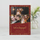 Dourado confetti enfeita o fundo vermelho burgundy na frente e atrás. Três fotografias de casal são recursos na parte frontal. Todo o texto abaixo inclui o grande que estamos em contato pode ser editado para personalizar seu lançamento exclusivo do noivado.