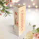 Esta é uma placa 3 em 1 com número de tabela, menu e nota de agradecimento. Este design vai ter impressão sem linha de pontuação. Dobre o cartão utilizando as linhas de pontuação no verso ou na base na medição mostrada na imagem.