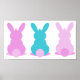 poster de três coelhos de Páscoa bonitos em cores pastéis, rosa, azul, roxo, perfeito para uma decoração de páscoa moderna. Mude a cor de fundo para decorar suas decorações de férias.