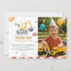 Share your gratitude with this construction photo thank you card featuring a yellow excavator, dump truck, and cheerful watercolor details beside your child’s favorite picture. A fun “for Diggin’ My Birthday!” message makes it the perfect keepsake for truck-loving kids’ parties and construction-themed birthdays. Coordinates with matching invitations, paper cups, and décor from the same collection.