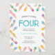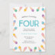Faça uma festa de aniversário de 4 anos para seu pequeno aniversário! Este adorável convite de aniversário apresenta sorvetes coloridos de aquarela do arco-íris que são bonitos e perfeitos para um aniversário de verão. Convide com estilo! Todos os detalhes, incluindo (exceto idade), são personalizáveis. (Outras idades e cores também disponíveis no meu compro!) © Mini Moi Impressões
