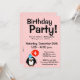 4º aniversário convites de festas com desenhos engraçados de pinguim. Convites personalizados para aniversários infantis e outras ocasiões divertidas. Texto de anúncio personalizável, número de idade e cor de fundo. Fundo cor-de-rosa girino com padrão de bolinhas branca. Crianças Quarto modelo de Aniversário. Idade específica, para uma menina de quatro anos.