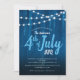 Este convite de festas de 4 de julho apresenta um histórico de madeira azul-escura russa, acentuado com cordas de luzes no topo. Isto é perfeito para a sua festa do quintal da quarta de julho.