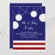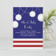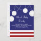 Um vermelho do divertimento, branco e azul 4o do convite de festas de julho com listras, luzes e lanternas.
