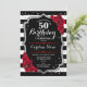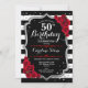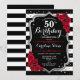 50º Aniversário Convite à apresentação de design vermelho preto Elegante com brilho falso. Listras pretas e brancas com rosas vermelhas. Perfeito para uma bolsa mensageifesta de aniversario elegante.