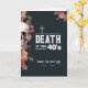 R.I.P. para sua juventude! Este cartão de 50º aniversário apresenta um crânio gótico com flores vermelhas, pretas e cor de pêssego sobre fundo preto profundo. Texto "Morte aos 40 anos, desculpe pela sua perda". dentro de vazio para a sua mensagem manuscrita pessoal.