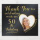 Crie rótulos de vinho espumante exclusivos em preto e ouro. Obrigado, com fotos personalizadas para os 50º favoritos da festa de aniversário. A na moda de design apresenta uma fotografia em forma de coração num quadro amarelo-ouro, o primeiro e sobrenome da dama de aniversário e o quinquagésimo marco. Você pode mudar o marco para o 30, 40º, 60º ou outros anos usando o modelo.