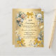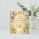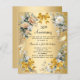 Um fundo de ouro falso. Decorados com flores brancas e amarelas, fitas para ouros e arcos. Personalize e adicione um nome e detalhes. 1 folha = 1 convite impresso de borda a borda.