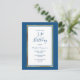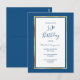 Na frente: um fundo azul clássico com um quadro fino de ouro e branco. Simples e elegante! Modelos para um nome e detalhes da festa. O nome e o texto: 50º Aniversário são escritos com um script de estilo manuscrito, letras azuis. Perfeito para um inverno ou festa de aniversário de primavera! Traseira: fundo azul clássico colorido. Dica: Se você não quiser que pareça um cartão postal, clique em personalizar, vá para o verso e remova o divisor e o carimbo de posto.