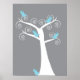 Cinco adoráveis pássaros azuis andam em uma árvore branca contra uma cinza de fundo nesta linda poster! Este impressão faz um excelente adicional para qualquer quarto!