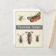 A frente deste obrigado de estilo vintage que você faz com o cartão-postal apresenta a mensagem apreciativa "Obrigado!", junto com uma representação de cinco insetos. O verso apresenta uma mensagem personalizada de apreciação. Um postal como este poderia ser usado para mostrar gratidão por algo que alguém fez.