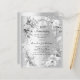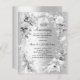 Um fundo de olhar mal prateado. Decorados com flores e uma fita falsa prateada, arcos e diamantes falsos. Personalize e adicione um nome e detalhes. 1 folha = 1 convite impresso de borda a borda.