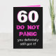 Esta engraçada carta de aniversário de 60 anos é para mulheres. Um grande 60 branco está borrado em rosa sobre um fundo preto com "NÃO PANIC" abaixo e depois "definitivamente ainda o tens". Dentro o cartão que você vai achar engraçado. Esta é uma carta maravilhosa para uma mulher celebrando seu sexagésimo com um bom senso de humor. Copyright Kathy Henis