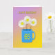 Feliz sorriso de flores margaridas em uma caneca azul brilhante, A idade de 65 anos está em amarelo na caneca. Uma maneira adorável de desejar um feliz aniversário de 65 anos.
