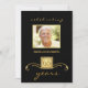 Convites de aniversário personalizados formais — Convites de fotos em preto e ouro elegantes, mas masculinos, com sotaques dourados detalhados e monogramas em parlamento simulado. Adicione sua própria foto e personalize o nome, a data e os detalhes da ocasião feliz. Perfeito para fotos contemporâneas ou antigas. Combinando envelopes, correio e cartões de agradecimento disponíveis. **NOTA: Dimensionado para cartões de convite padrão 5 x 7. Outros tamanhos e estilos disponíveis na galeria.
