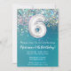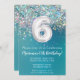 6 Birthday Invitation Teal and Silver Glitter 6 convite de aniversário por 6 anos com moderno roteiro escrevendo e balões de folha divertida.