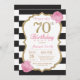 Convite de aniversário de 70. Preto rosa e Dourado. Dourada Glitter. Black and White Stripes. Flor Floral Rosa. Aniversário Adulto. Festa de aniversário feminina. Para mais personalização, clique no botão "Personalizar" e use nossa ferramenta de design para modificar este modelo.