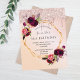 Na frente: Um convite para uma festa de aniversário de 70 anos. Um rosa dourado, fundo branco cor-de-rosa cor-de-rosa com uma falso estrutura geométrica dourada. Decorados com flores roxas escuras e burgueiras, rosas e penas do estilo "boho". Derramamento de ouro rosa. Modelos para um nome e detalhes da festa. O nome é escrito com um script de estilo manuscrito, letras coloridas de cinza. Traseira: Rosa dourado, fundo cor-de-rosa-rosa-claro. Dica: Se você não quiser que pareça um cartão postal, clique em personalizar, vá para o verso e remova o divisor e o carimbo de posto.