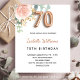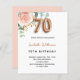 Um convite elegante para uma festa de aniversário 70. Um fundo branco chic. Decorados com um rosa de ouro e rosa cor-de-rosa-esbranquiçada, folhas de eucalipto florais, verdes, galhos, verde e borras de ouro. Personalize e o nome e os detalhes da festa. Letras pretas e ouros. O nome é escrito com um moderno estilo escrito à mão. O número 70 é escrito com uma fonte no estilo do balão de ouro. Traseira: cor de fundo rosa dourada.